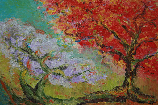 Zomer pracht Bloeiende takken, wuiven wolken tekenen lila op de heuvel luchtig het hemels blauw kust rood Bomen zomer olieverf op linnen 100/120